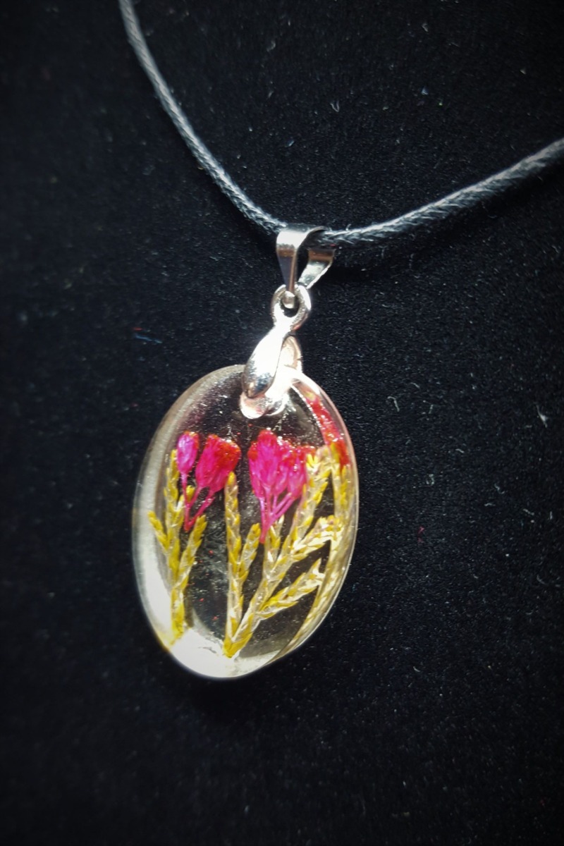 Pandantiv EpoSpring Tulips, parte din colectia EpoSpring. Este un produs unicat turnat intr-un mulaj de forma ovala. Facut din rasina epoxidica transparenta, cu frunze si flori uscate miniaturale, se vinde impreuna cu un snur de culoare neagra si accesorii metalice argintii.